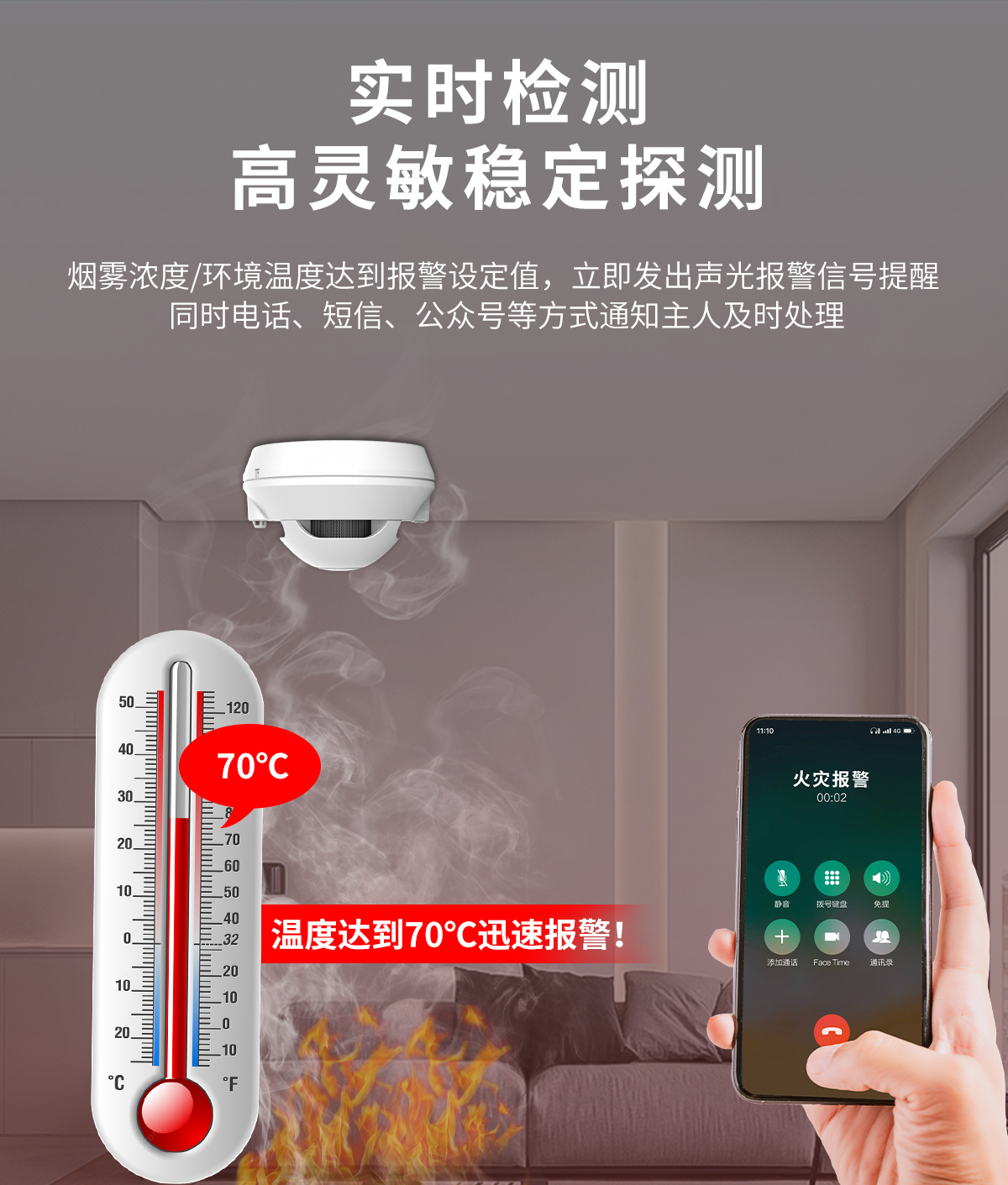 火灾烟雾探测灵敏度高,零误报,烟温复合探测器